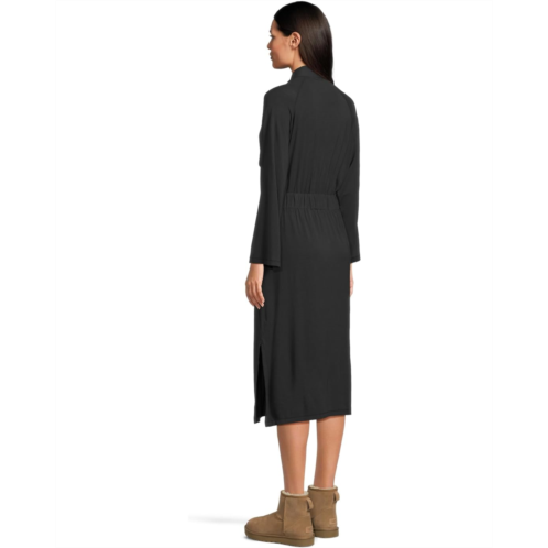 Styled with a fixed waist tie belt with a cinched back, the UGG Myra Robe is designed to bring you superior comfort and style. Made from a viscose and elastane blend for a drapey fit, this midi-length robe also comes with a cotton hanger loop. It is designed with Bracelet length sleeves, side slits, a V-neckline, and a straight hem. Comfortable and stylish, this robe features the UGG logo woven flag label clamped on the wearer's left pocket.