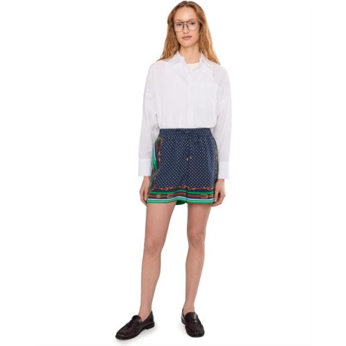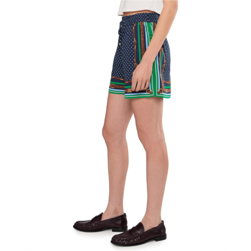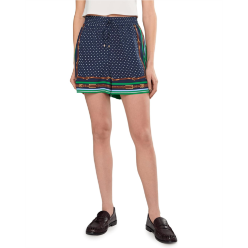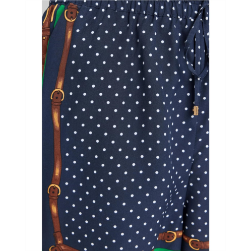Crafted from airy crepe de chine, these Lauren Ralph Lauren Belting-Print & Polka-Dot Drawcord Shorts meld classic polka dots with Ralph Lauren's equestrian-inspired belting print. 'LRL'-engraved cord ends add a subtle signature finish. It features an elasticized drawcord waist, two side on-seam pockets, and a high-rise waist.