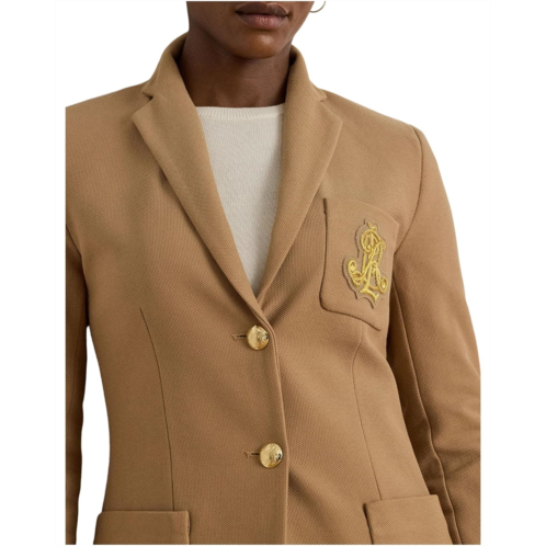 The Lauren Ralph Lauren Petite Bullion Jacquard Blazer is a statement piece designed to add refined elegance to your everyday style. Crafted in a slim fit, it highlights your silhouette while ensuring all-day comfort. Featuring classic notch lapels and a two-button front closure, this blazer balances tradition with contemporary flair. Long sleeves with four-button cuffs and crest-embossed buttons enhance its heritage-inspired detailing, while patch pockets, including a distinguished left chest pocket, add both functionality and charm. The standout detail is the embroidered bullion 'LRL' patch, a mark of signature Ralph Lauren sophistication that exudes exclusivity.