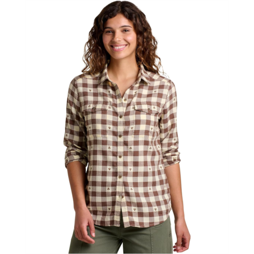 The Toad&Co Re-Form Flannel Long Sleeve Shirt for an outdoor queen. It is a lightweight herringbone weave made better by recycled polyester that is available in epic color combos. This shirt is comfortable and stylish and made from soft, lightweight herringbone twill crafted from post-consumer plastic bottles and salvaged cotton textiles. This shirt is perfect for any casual outing, featuring long sleeves with adjustable cuffs, a classic collared neckline, two button-through chest pockets with flaps, and a buttoned front closure. The droptail hem adds a modern touch to this classic design.
