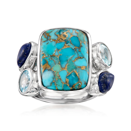 Ross-Simons travels the world to find beautiful, high-quality styles at the best prices. Go bold with the cool tones of our earthy ring. An eye-catching 18x13mm rectangular stabilized turquoise gem gleams with with added copper to create its shimmery matrix. The dreamy blue color palette continues with 7x5mm pear-shaped lapis cabochons and 1.90 ct. t.w. sky blue topaz rounds. Crafted in polished sterling silver. Natural pyrite flecks in lapis will vary. 3/4' wide. Sky blue topaz, lapis and turquoise ring. Each Ross-Simons item arrives in a fine jewelry presentation box. Shop Ross-Simons jewelry risk-free as all items include a 30-day, 100% money-back guarantee.