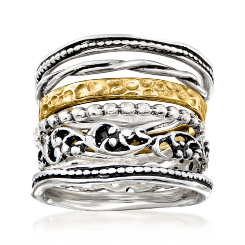 Ross-Simons travels the world to find beautiful, high-quality styles at the best prices. Mix and match this contemporary ring stack! The set of six features five oxidized sterling silver bands and one 18kt yellow gold over sterling silver with intricated textured and polished details. 5/8' wide. 18kt gold over sterling and sterling silver ring set. Each Ross-Simons item arrives in a fine jewelry presentation box. Shop Ross-Simons jewelry risk-free as all items include a 30-day, 100% money-back guarantee.