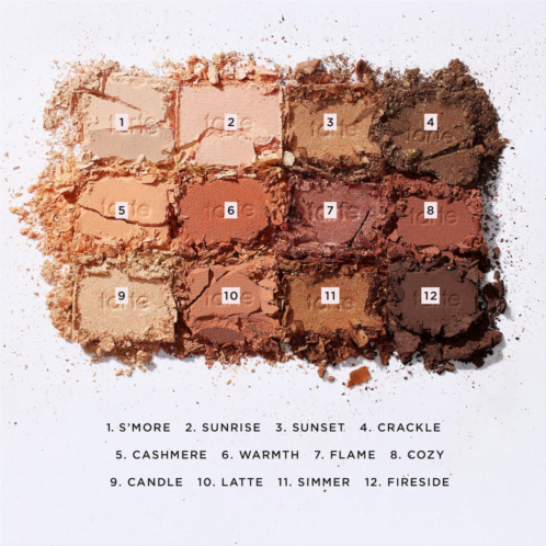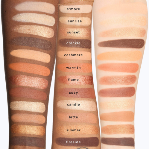 - 12 x 0.046 oz/ 1.3 g Shades in S'more (matte pinky beige), Sunrise (golden-beige sheen), Sunset (bronzer shimmer), Crackle (matte brown with gold floating glitter), Cashmere (matte pale peach), Warmth (matte terracotta), Flame (rust shimmer), Cozy (matte brick), Candle (champagne shimmer), Latte (matte tan), Simmer (copper shimmer), Fireside (matte deep plum)