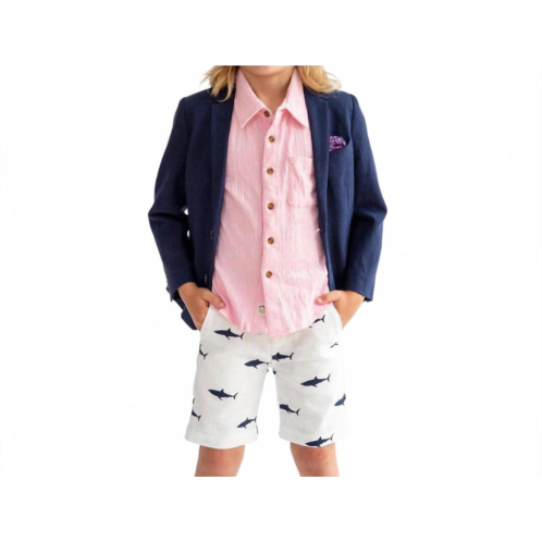 Introducing the Boy's Nautical Trouser Short by Appaman, the ideal choice for summer holidays and dressy events. Crafted from a cotton blend with a composition of 55% Ramie and 45% Cotton, these shorts feature a cool shark print in Great White. With a slim cut and adjustable inner waistband, they're designed for both comfort and style. Care for these patterned shorts is easy with dry clean instructions.