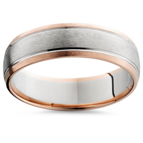 Mens ring measures 6mm and features brushed white and rose gold.