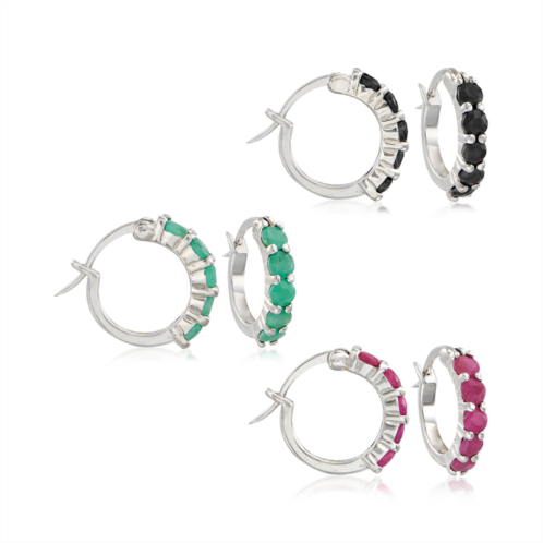 Ross-Simons presents contemporary styles with a timeless appeal. Here's a lovely trio for your jewelry box. Indulge in the must-have magnificence of three major gemstones, each decorating a pair of just-right sterling silver huggie hoop earrings. One pair featuring 1.00 ct. t.w. round rubies, one pair featuring .70 ct. t.w. round emeralds, and one pair featuring .90 ct. t.w. round black sapphires. 1/8' wide. Hanging length is 1/2'. Snap-bar, multi-stone huggie hoop earring set. Each Ross-Simons item arrives in a fine jewelry presentation box. Shop Ross-Simons jewelry risk-free as all items include a 30-day, 100% money-back guarantee.