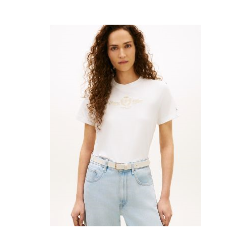 Tommy Hilfiger women's T-shirt. Our tee is cut in a comfortable, flattering fit from soft and stretchy cotton jersey. This version is finished with our embroidered club crest logo with a gold-tone metallic finish for an elevated look.