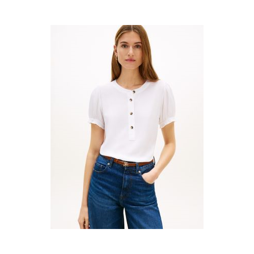 Tommy Hilfiger women's shirt. This short-sleeve pullover shirt is made from lightweight viscose that's been treated with a garment wash for enhanced softness and drape. Designed in an easy, flattering fit with delicate shirring at the shoulder, it works for the office or weekend brunch.