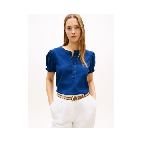 Tommy Hilfiger women's shirt. This short-sleeve pullover shirt is made from lightweight denim with a touch of lyocell for a soft, smooth feel. Designed in an easy, flattering fit with delicate shirring at the shoulder, it works for the office or weekend.