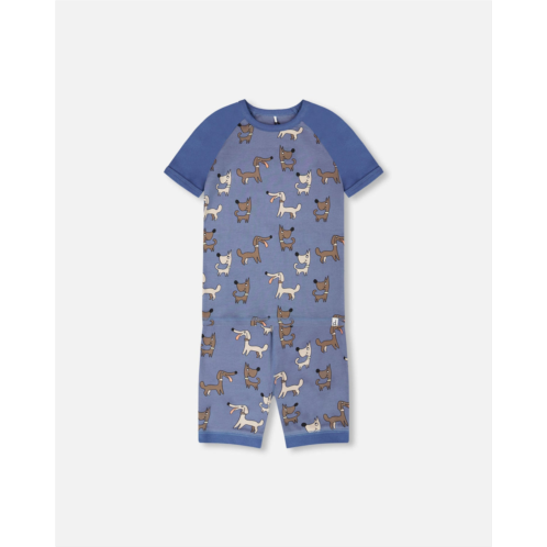 Puppy dreams come alive in this organic cotton two-piece pyjama set in blue with dog print from our “Starry Night” collection. This set features a contrasting short-sleeve t-shirt with a playful dog print on the chest, while the matching shorts are covered in the same allover dog print with an elastic waist for comfort and contrasting borders. Made in 100% organic cotton, this set is breathable, soft, and perfect for cozy nights.