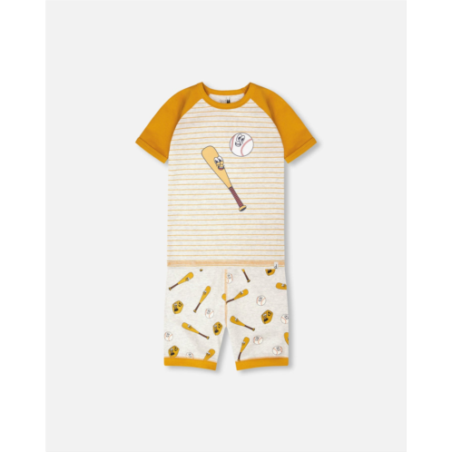 Dreams are a home run in this organic cotton two-piece pyjama set in grey mix with baseball print from our “Starry Night” collection. This set features a contrasting short-sleeve t-shirt with playful stripes, a fun bat, and ball details, while the matching shorts are covered in an allover baseball print with an elastic waist for comfort and contrasting borders. Made in 100% organic cotton, this set is breathable, soft, and perfect for cozy nights.