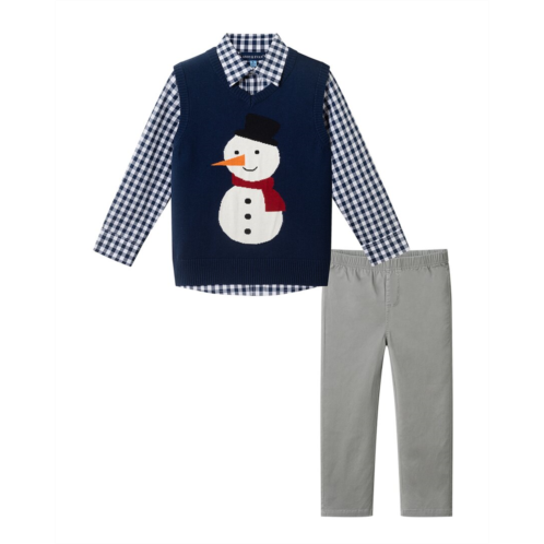 Introducing the Andy & Evan Sweater Vest Set, a stylish and versatile outfit for your little boy. This set includes a navy sweater vest made of 100% cotton, a matching shirt also crafted from 100% cotton, and comfortable pants made of 97% cotton and 3% spandex. Perfect for any occasion, this ensemble is easy to care for with a simple machine wash. Imported and designed with quality and style in mind, your little one will look sharp and feel comfortable in this outfit.