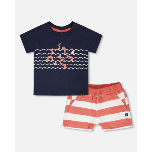 The organic cotton t-shirt and short set in blue and brick stripes brings playful seaside vibes to everyday adventures. This set includes a soft short-sleeve jersey t-shirt with a fun octopus print swimming among the waves, paired with striped woven shorts designed with practical pockets and an elastic waistband with drawstring. A breezy duo from the 'Coastal Days' collection, made for comfort and style under the sun.