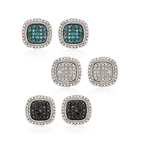 Ross-Simons presents contemporary styles with a timeless appeal. Dazzling diamonds in three compelling colors! Our jewelry set features three pairs of cushion-shaped earrings, each sparkling with .30 ct. t.w. white, black and blue pave diamonds. Crafted in polished sterling silver. Blue and black rhodium. Post/clutch, multicolored diamond earring set. Our blue diamonds are natural diamonds that have been treated which causes the color change and then heated to hold the color. The color change process is permanent. Each Ross-Simons item arrives in a fine jewelry presentation box. Shop Ross-Simons jewelry risk-free as all items include a 30-day, 100% money-back guarantee.