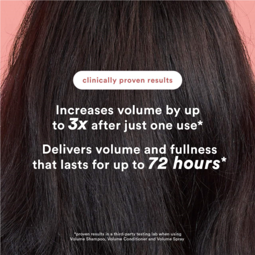 Clinical Results: In a third-party testing lab when using Volume Body Boosting Shampoo, Volume Enhancing Conditioner, and Volume Spray: