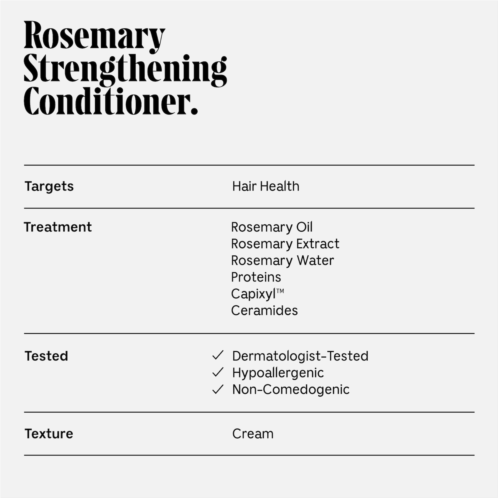 What it is:Treatment Conditioner with Rosemary Oil, Plant Proteins + Essential Ceramides to help strengthen hair. Signature scent of Rosemary. Dermatologist-Tested.