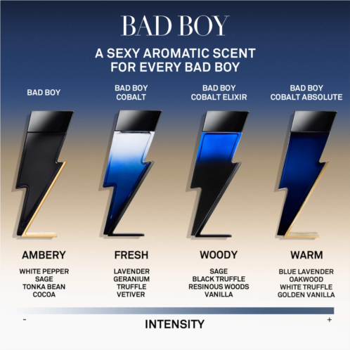 About the Fragrance: Bad Boy Cobalt Absolute captures masculine refinement at its peak. Aromatic, warm, and woody spicy, with hints of golden vanilla, this long-lasting men’s scent blends strength and elegance in a rich, seductive expression.