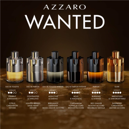 About the Bottle: The iconic Azzaro Wanted bottle, instantly recognizable with its barrel shape, is boldly reinvented. Imagined as a precious object of desire, it adorns itself in gold and captures all eyes. A fitting vessel for the Elixir, it is luxurious, unforgettable, and irresistible.