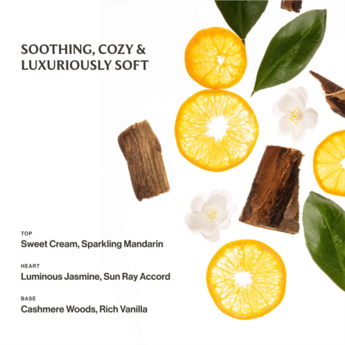 Fragrance Description: Soothing, cozy, and luxuriously soft. A gentle blend of sweet cream and rich vanilla with serene notes of jasmine and cashmere woods. Fragrance Family:Earthy & Woody