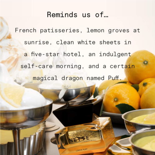 About the Fragrance: \'For Lemon Puff, we delivered a brief full of magic to our perfumerthe lemon groves at sunrise, toasted meringue, crisp white sheets in an old-world five-star hotel, and a Parisian patisserie. And a nod to a certain enchanted dragon by the sea named Puff. This perfume projects a pure and innocent kind of love and is scientifically backed to boost feelings of happiness and relaxation. Developed in Paris by renowned perfumer Jean-Christophe Herault.\' -Carol Han Pyle