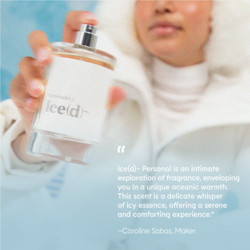 About the Fragrance: \'Ice(d)- Personal is an intimate exploration of fragrance, where Frozen Mango, Spearmint, and Seaweed gently envelop you in an oceanic warmth. Sandalwood and Skin Musk add a cozy, personal touch. This scent is a whisper of icy essence, offering a serene, comforting experience.\'Caroline Sabas, Maker