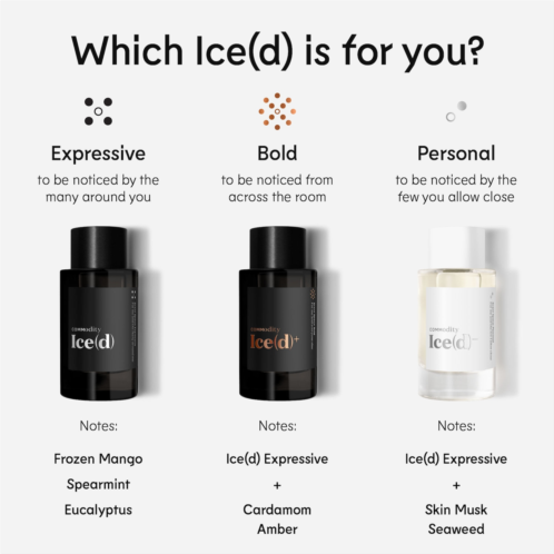 About the Bottle: Commodity’s Personal Collection is housed in ethereal, all-white bottles, illustrating the soft skin scent fragrances housed within. The - sign further highlights their intimate projection. See also Ice(d) Expressive for a balanced take and Ice(d) + Bold for a powerhouse take on the unisex perfume (each sold separately).