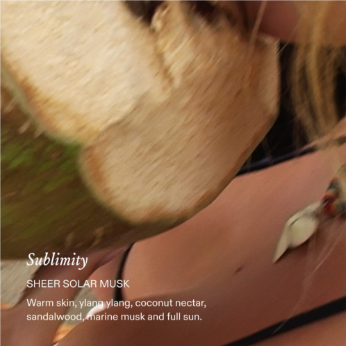 Fragrance Description: Sublimity Eau de Parfum contains notes of sheer solar musk, opening with the lush warmth of coconut nectar and ylang ylang blossom. Like a beach only 4WD can get to, Sublimity Eau de Parfum breaks into an elevated heart of sea salt and sandalwood, before holding you in the close kiss of full sun. Did you know inside a wave, time stands still?