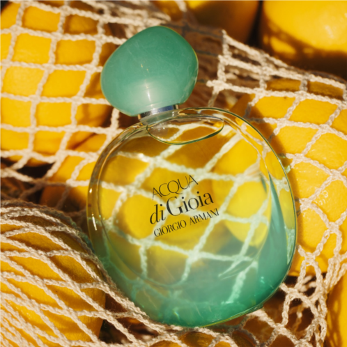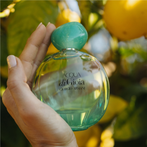 About the Bottle: A new, alluring, contrasted bottle, crafted in the iconic Acqua di Gioia rounded shape, with its organic-looking form now dressed in graduated tones of green, evolving from a translucent pale mint at the flacon’s top to a deeper, light-filled turquoise intensity at the base.