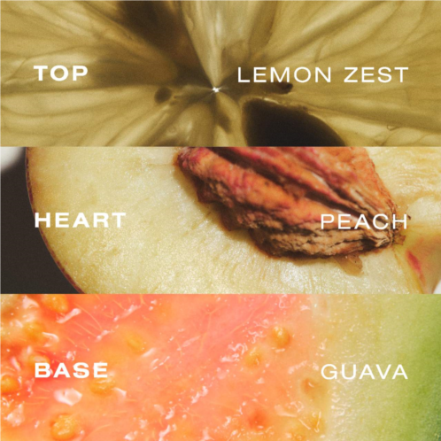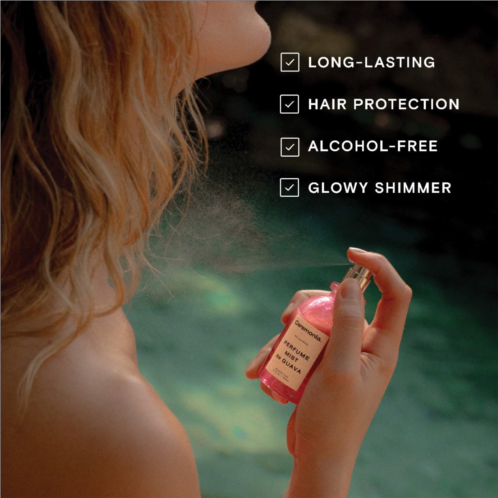 Fragrance Description: This alcohol-free mist won’t dry out your skin or hair. Tropically scented with notes of guava, lemon zest, and peach, this 98 percent naturally derived formula delivers a glowing shimmer while adding shine.