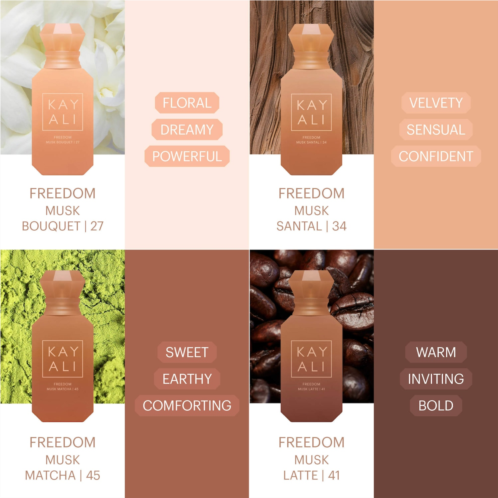 Set Description: Celebrate the beauty of self-expression with the limited-edition KAYALI Musk Obsessions Miniature Set. Perfect to gift or collect, this set features four unique creations from the Freedom Collection: Freedom Musk Bouquet | 27, Freedom Musk Santal | 34, Freedom Musk Matcha | 45, and Freedom Musk Latte | 41all in deluxe miniature sizes. Each fragrance reveals a different expression of muskfrom soft florals to bold spices, warm woods to creamy gourmandsto create a scent story that’s unapologetically and uniquely yours. Wear them on their own or layer with your fragrance faves to create your own scent mood.