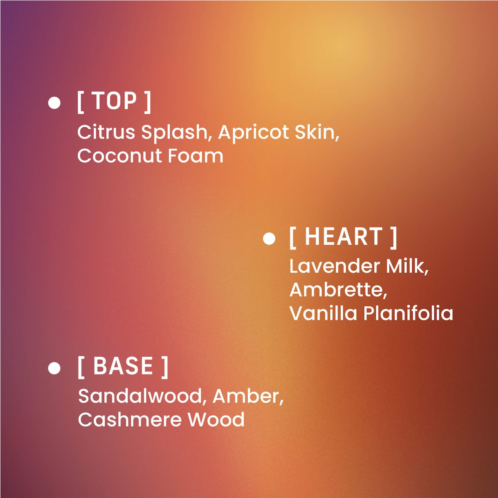 Fragrance Description: This warm-woody amber fragrance evokes the thrill of a first connection. It opens with a bright spark of citrus and tender apricot skin, softened by creamy coconut and velvety lavender milk, before settling into warm, magnetic cashmere woods that linger like a subtle, unforgettable glow.