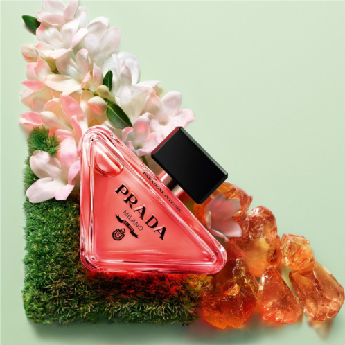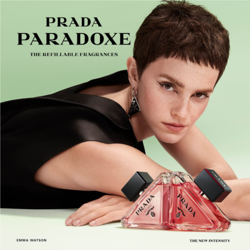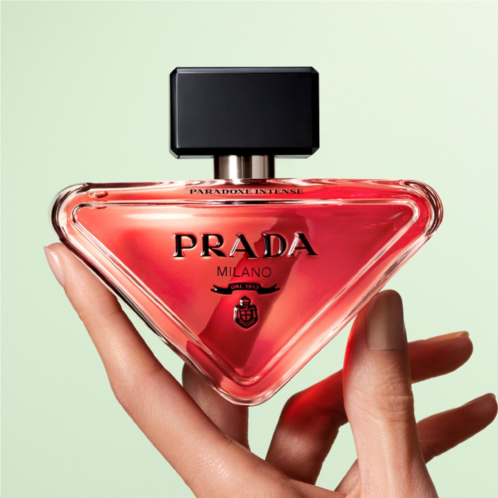 About the Bottle: This perfume bottle is an expression of the House’s essence of reinvention and predilection for contrasts. In a shift from the traditional perfume bottle architecture, the flacon is minimal and delicate at first glance, inspired by the original, iconic Prada triangle logo, disruptively designed to rest on its side. The Prada coat of arms logo contrasts with the deep pink color of the fragrance. The bottle is finished with ‘Paradoxe Intense’ on its top chamfer.