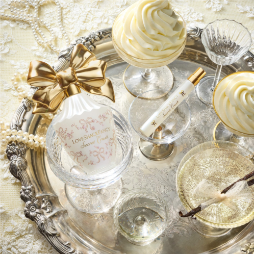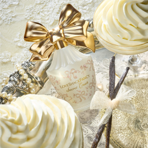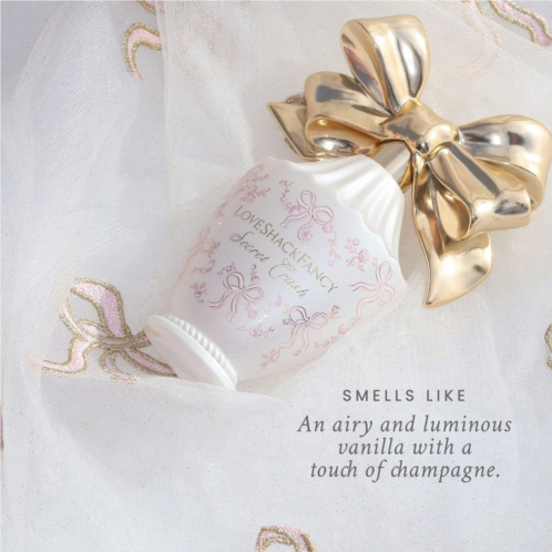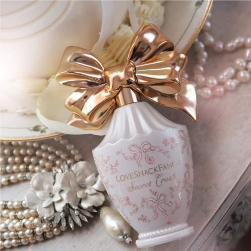 About the Bottle: An oversized bow, perfectly imperfect. The LoveShackFancy perfume bottle references founder Rebecca Hessel Cohen’s lifelong love of ribbons. A sculptural golden bow top appears tied by hand, and the pearlescent bottle is decorated with the pink and gold Coquette Bow print.