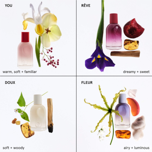 Set Description:This wardrobe set features the bestselling Glossier You fragrance alongside Reve, Doux, and Fleur. Each fragrance comes in an adorable trial size, perfect for discovering your next favorite scent.