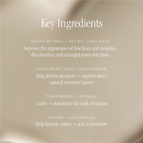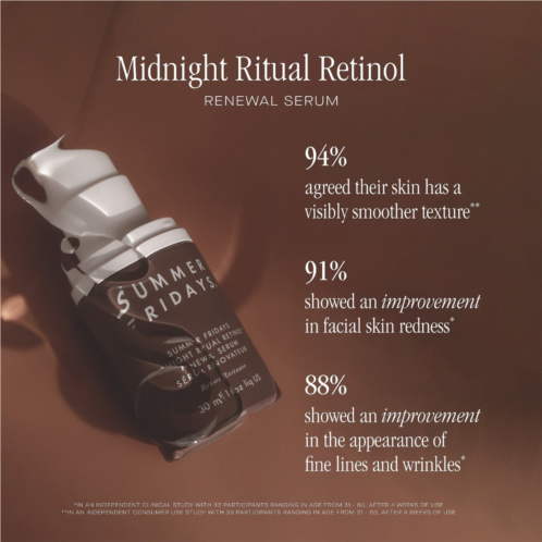 Clinical Results: In an independent, consumer-use study with 33 participants ages 31 to 60, after 4 weeks of use using Midnight Ritual Retinol Renewal Serum: