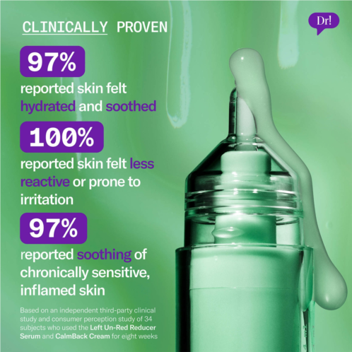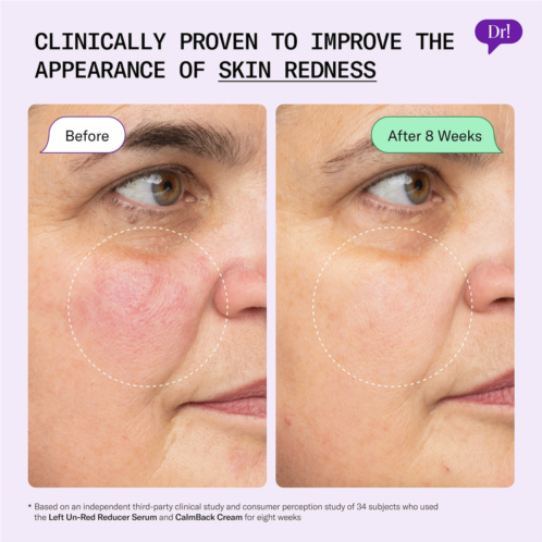 Clinical Results: Based on an independent, third-party clinical study and consumer-perception study of 34 subjects who used the Left Un-Red Reducer Serum and CalmBack Cream for 8 weeks: