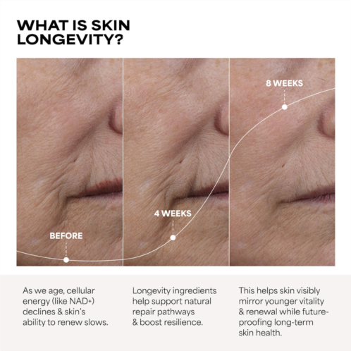 What Else You Need to Know: As cellular energy declines, visible signs of aging accelerate. Backed by NAD-supporting tech and five years of research, this next-gen formula helps skin visibly mirror younger skin’s vitality and renewal while slowing 12 signs of aging to future-proof its resilience, quality, and long-term skin health.