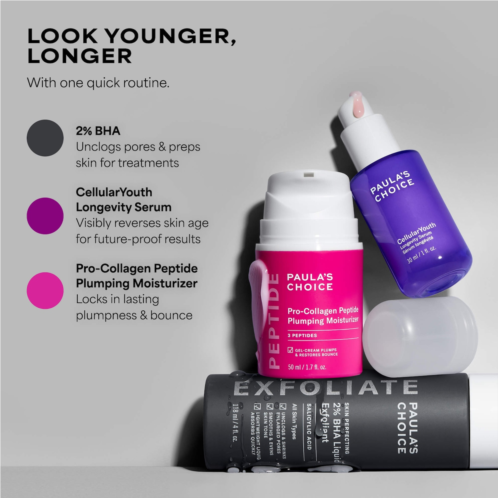 - Age-Disrupting Complex (Longevity Peptide and Taurine): Extends skin’s youthful look and aids natural renewal that slows with age.