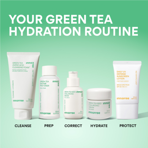 - Green Tea and Five Types of Hyaluronic Acid: Moisturize and intensely hydrate.