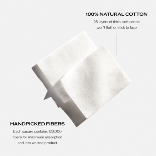 What Else You Need to Know: Each square contains a blend of 123,000 cotton fibers, woven into 28 layers with high moisture-absorbing and releasing properties for less wasted product. The facial cotton squares add a gentle exfoliation benefit to improve skin roughness and are specially crafted to maintain their shape so that fibers don't fluff or stick to the face.