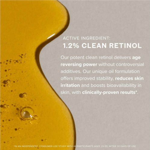- 1.2% Clean Retinol: Diminishes visible signs of aging and improves the look of skin texture.