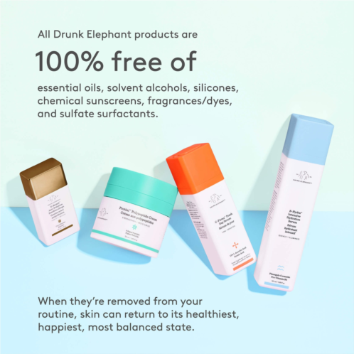Drunk Elephant is committed to using only ingredients that either directly benefit the health of the skin or support the integrity of their formulations. The brand focuses on healthy pH levels, formulations the skin recognizes, small molecular structure that’s easily absorbed, and effective active ingredients that also support the skin’s acid mantle. All of their products are designed to be mixed togetherwhat Drunk Elephant calls making a smoothie. (This is true for all of their products except their sunscreen, Umbra, which sits on top of the skin, protectin