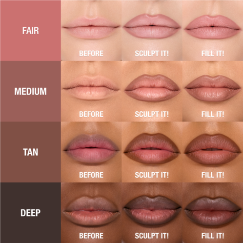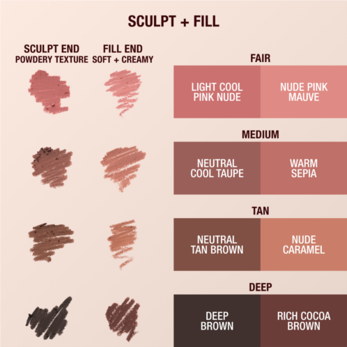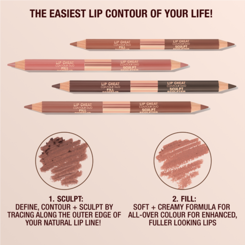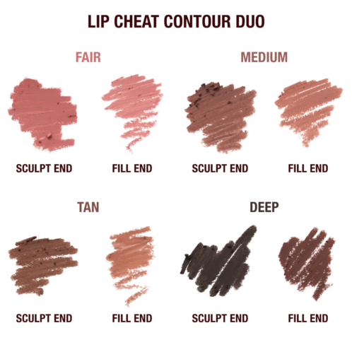 What Else You Need to Know: Sculpt and fill for enhanced-, fuller-looking lips with Charlotte Tilbury’s Lip Cheat Contour Duo. The duo features two long-wearing formulas: a darker, precision 'sculpt' end to create contouring shadows, paired with a lighter, soft and creamy 'fill' end to add all-over color. Discover four 90s nude shades expertly formulated for fair, medium, tan, and deep skin tones.
