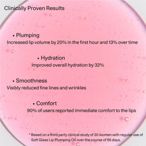 Clinical Results: In a third-party clinical study of 30 women with regular use of Soft Glass Lip Plumping Oil over the course of 56 days, results showed: