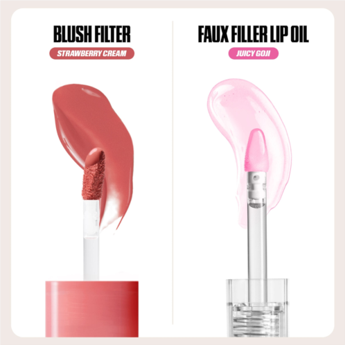 What Else You Need to Know: Discover Blush Filter Liquid Blush in Strawberry Creama filtered finish, without the filter. Blush Filter is a lightweight liquid blush with buildable pigments and finely milled micro-pearls for a soft-focus, \'airblushed\' finish that has major staying power. With Faux Filler Lip Oil in Juicy Goji, enjoy juicy jelly lips in just one swipe. Faux Filler Lip Oil is a softening, ultra-hydrating tinted and flavored lip oil packed with peptides and shea butter for extra juicy, nonsticky, ultra-shine lips.