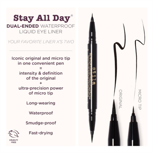 What Else You Need to Know: This all-in-one, dual-ended liquid eyeliner features stila‘s bestselling waterproof liquid liner on one side and a micro tip on the other. The original tip effortlessly delivers any lookfrom a thin line to a bold, dramatic stroke. The ultra-precise micro tip provides superior accuracy and control.