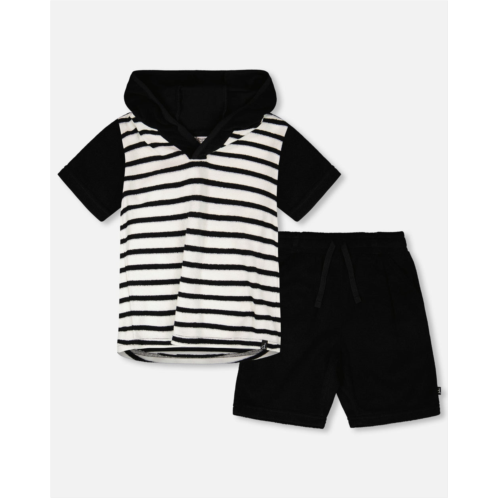 The hooded terry t-shirt with shorts set is perfect for seaside style and comfort. This two-piece set includes a short-sleeve hooded t-shirt in black and white stripes and matching solid black shorts, crafted in soft terry cotton blend for breathable wear. Easy to pull on with an elastic waist, adjustable drawstring, and casual fit, it’s a versatile summer outfit for boys.