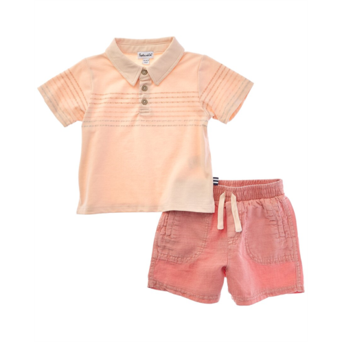 - 2Pc Picnic Polo Shirt & Short Set In Orange Stripe With Spread Collar; Elastic Waist, Two Front Pockets