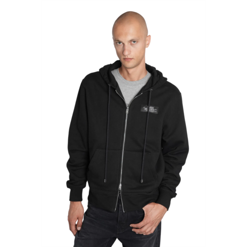 This striking black zip-up hoodie epitomizes modern streetwear sophistication, featuring a front zipper closure and a drawstring hood for a tailored look. Detailed with a subtle rectangular patch on the chest and a bold printed design on the upper back, it captures attention effortlessly. The inclusion of front pockets and ribbed cuffs and hem provide both practicality and a snug fit, making it an essential addition to any contemporary wardrobe. - Front zipper closure - Drawstring hood - Rectangular patch on chest - Bold printed design on upper back - Front pockets - Ribbed cuffs and hem