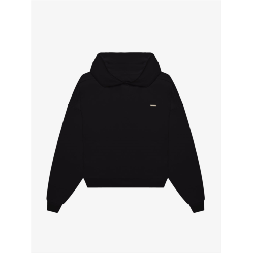 Boxy hooded sweatshirt in soft brushed heavyweight organic cotton, raw edges at hood, oversized hood, gold plate with engraved logo at chest, and signature black leather badge at back.-Body - 100% Organic Cotton-Color - Black-Boxy / Oversized Fit-Model is 6'1'' / 185cm and wears M-Care - Dry clean recommended-Made in Turkey